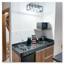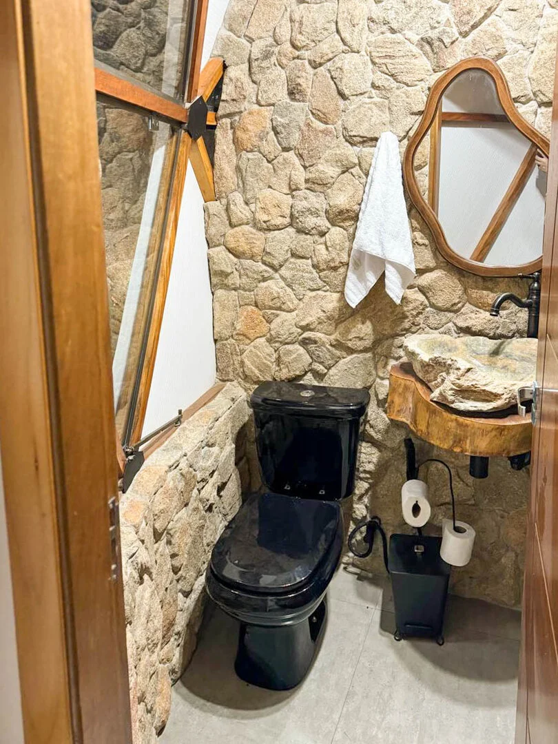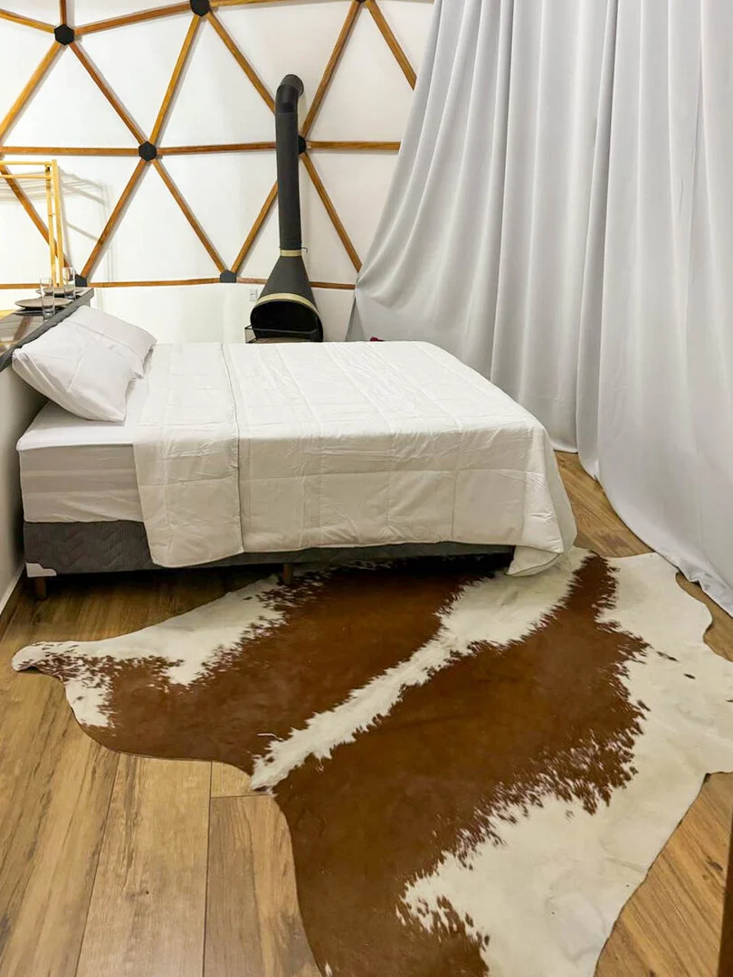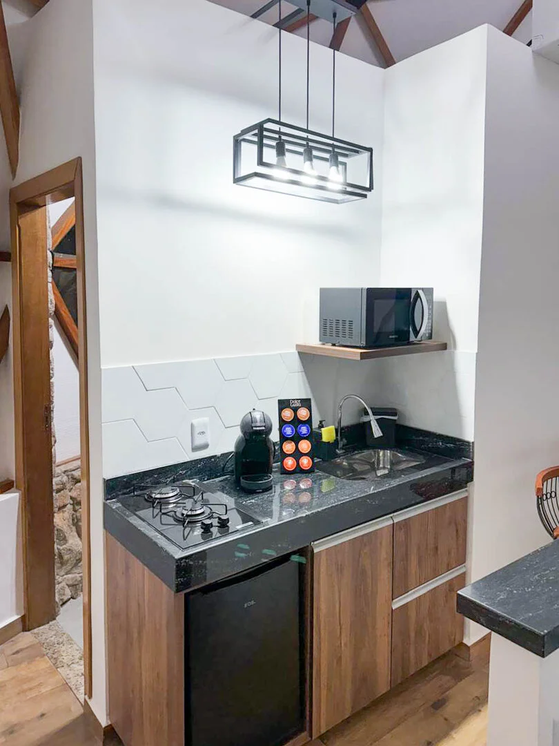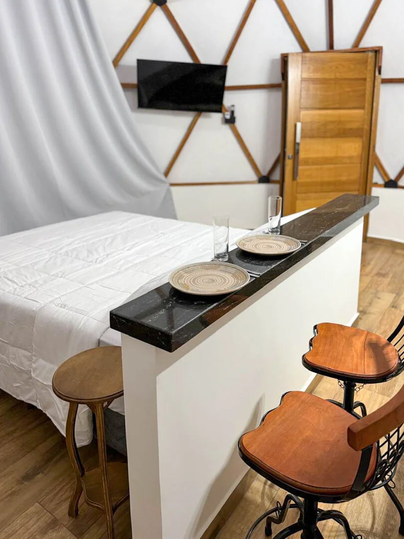 A Domo da Mata ainda possui um espaço gourmet com churrasqueira, pira com bancos para fogueira e um deck de madeira com rede, proporcionando o cenário perfeito para momentos românticos e descontraídos. Além disso, o quarto é equipado com uma máquina de café expresso com cápsulas de cortesia, cooktop e micro-ondas para maior praticidade durante a estadia.