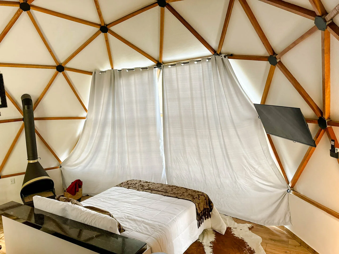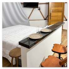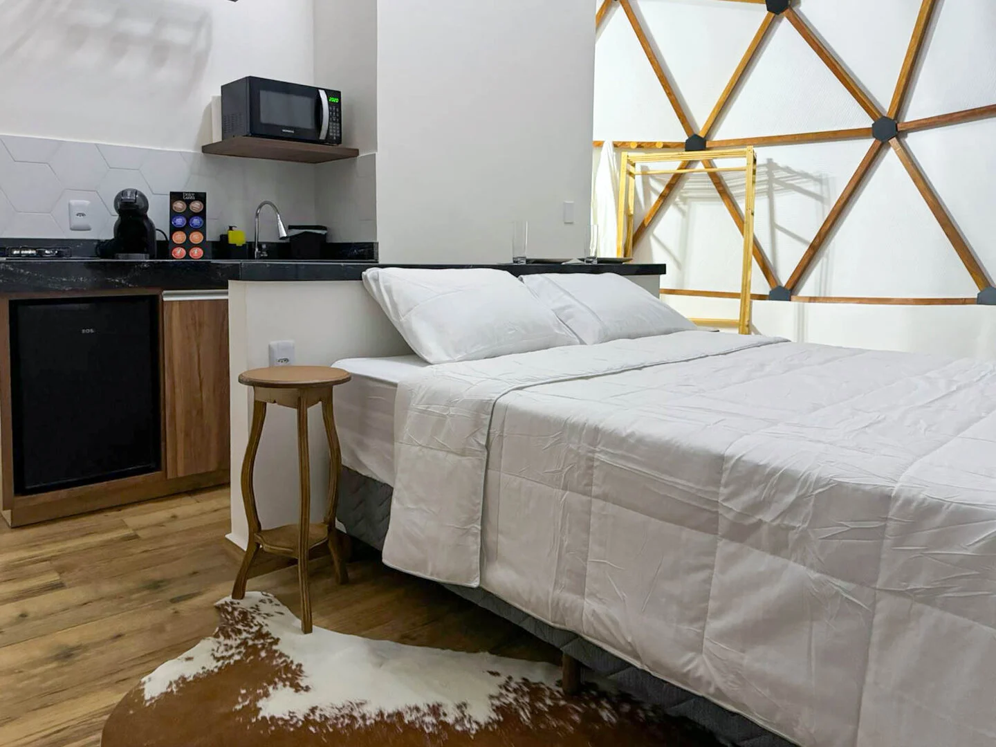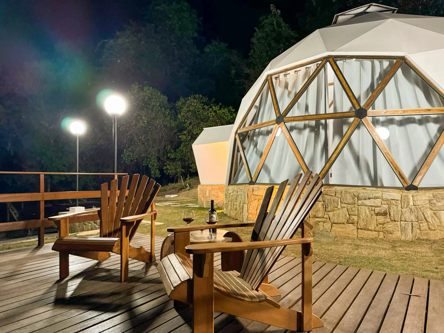 A Domo da Mata ainda possui um espaço gourmet com churrasqueira, pira com bancos para fogueira e um deck de madeira com rede, proporcionando o cenário perfeito para momentos românticos e descontraídos. Além disso, o quarto é equipado com uma máquina de café expresso com cápsulas de cortesia, cooktop e micro-ondas para maior praticidade durante a estadia.
