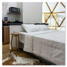 O ambiente conta com uma cama queen com enxoval de 100% algodão, garantindo noites de sono tranquilas. Para completar o conforto, há ar condicionado quente e frio, lareira, TV smart de 42 polegadas e frigobar. O banheiro oferece chuveiros duplos, secador de cabelo e amenities exclusivos.