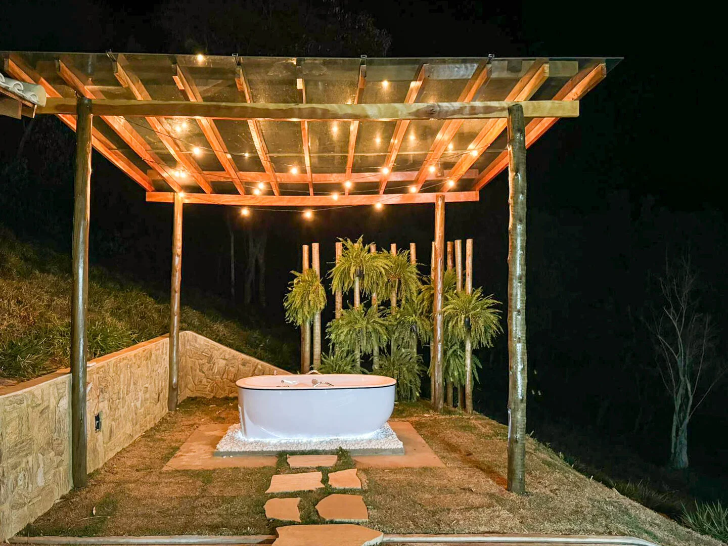 A Domo da Mata ainda possui um espaço gourmet com churrasqueira, pira com bancos para fogueira e um deck de madeira com rede, proporcionando o cenário perfeito para momentos românticos e descontraídos. Além disso, o quarto é equipado com uma máquina de café expresso com cápsulas de cortesia, cooktop e micro-ondas para maior praticidade durante a estadia.